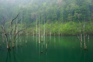 自然湖は長野県木曽郡大滝村にある湖。御嶽山の山体崩壊から引き起こされた土石流が王滝川に流れ込み、堰き止められ、深い谷間の森が沈み天然湖が形成されたとのこと。撮影は2015年5月4日。13時頃。木曽町の国道19号から大滝村を通る道路に入っていく。この日は曇りで雨もぱらついていたと思う。しかし旅行の日程上、この日しか撮影の時間がなかったので、とにかく行ってみた。湖面は静かで、立ち枯れた木がのぞいている。雲の薄いところから、わずかに柔らかい光が差し込んだ瞬間にシャッターを切った。